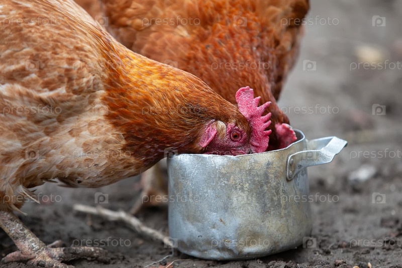 Куры клюют зерна из металлической чаши во дворе фермы