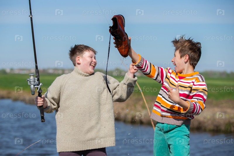 Два друга мальчика зацепили старую рыболовную удочку для обуви и посмеялись