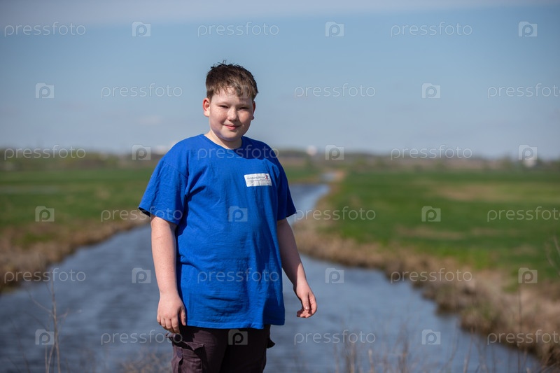 Подросток позирует на фоне реки и зеленого луга