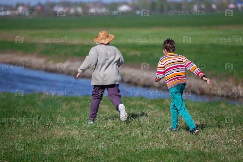 Двое мальчиков бегут друг за другом в природе.Дети на летних каникулах