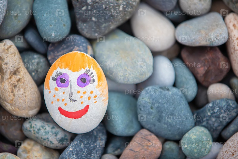 Белый камень с окрашенным положительным лицом на фоне серого морского гальки