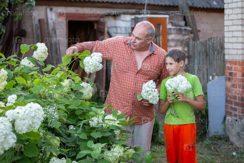 Дедушка учит внука ухаживать за садом.Человек и мальчик стоят в саду, глядя на растение гортензии с белыми цветами