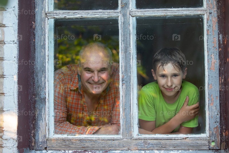 Дедушка и внук смотрят в окно деревенского дома и улыбаются. День отца. Мальчик и мужчина в окне