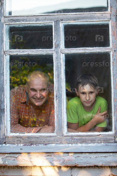 Дедушка и внук смотрят в окно деревенского дома и улыбаются. День отца. Мальчик и мужчина в окне