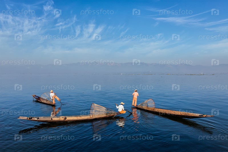 Традиционные бирманские рыбаки с рыболовными сетями на лодках на озере Инле в Мьянме известны своим отличительным одноногим стилем гребли