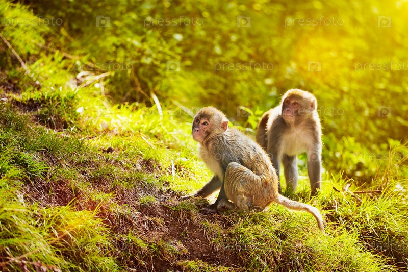 Макаки rhesus в лесу