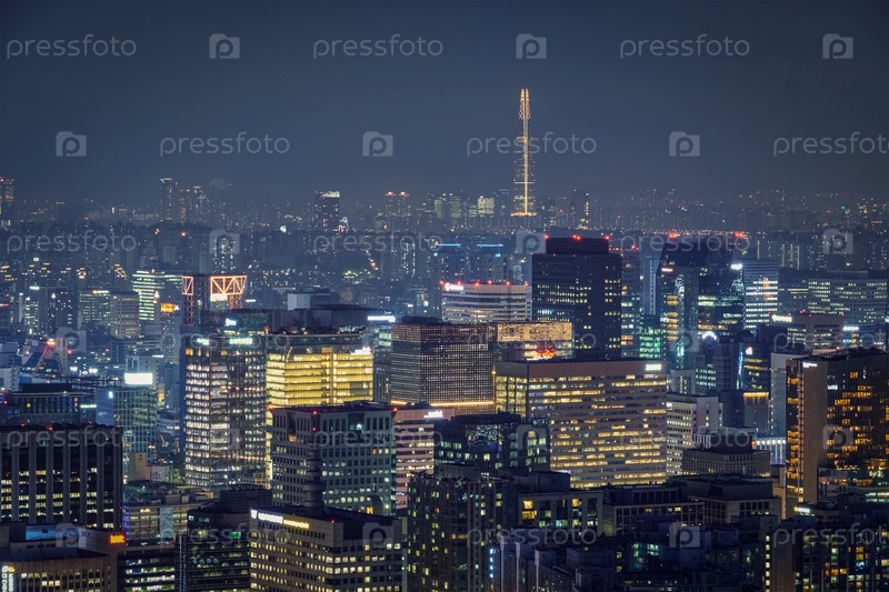 Городской пейзаж Сеула освещается огнями и башней Намсана Сеул вечером с горы Инван