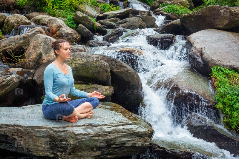 Йога медитация женщина асана Padmasana Лотус позирует на открытом воздухе у тропического водопада