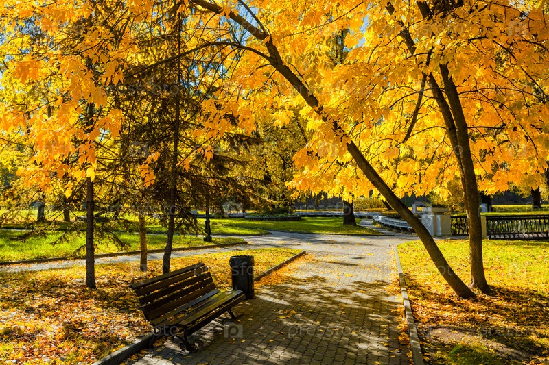 Осенние краски - падение в парк с желтыми листьями листопадных деревьев