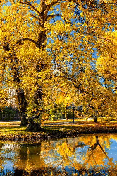 Осенние краски - осадки в парке с желтыми листьями листопадных деревьев, отражающимися в речной воде
