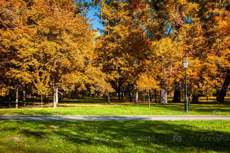 Осенние цвета - падающие в парк желтые листья листопадных деревьев и зеленая трава