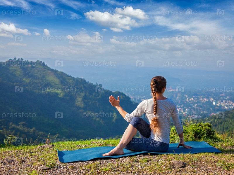 Hatha Yoga Outdoors - Спортивная женщина, практикующая асану йоги Parivrtta Marihyasana (или ardha macendrasana) - малоподвижное вращение на открытом воздухе в горах утром