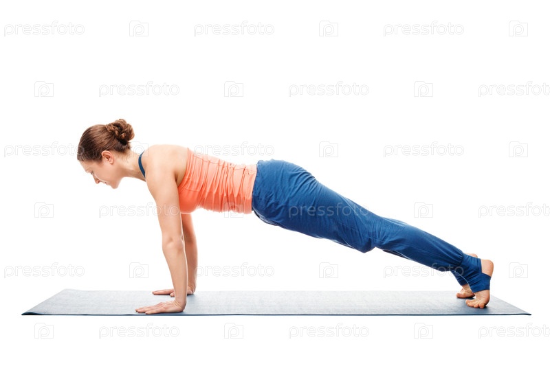 Женщина, практикующая йогу puna Uthita chatranga Ухита чатранга Дададана или фауана