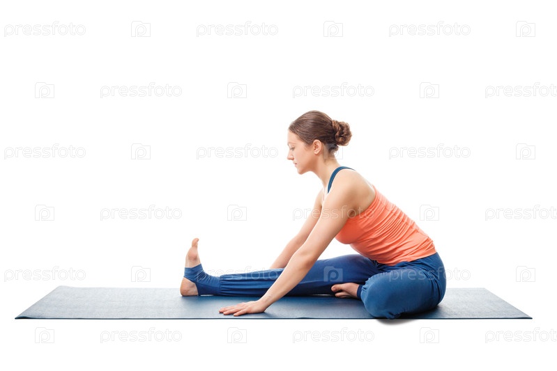 Молодая красивая спортсменка, занимающаяся Аштанга Виньяса Йоги асана Яну Сирсасана A - голова до коленной позы Разнообразие осанки для новичков, подчеркнуто белым