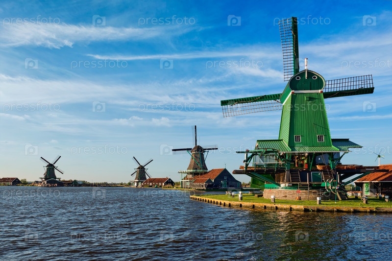 Голландская деревня Ветряные мельницы на знаменитом туристическом объекте Заансе-Шанс в Нидерландах