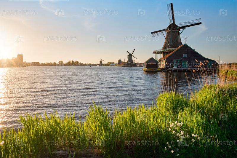 Ветряные мельницы в Заансе-Шанс в Голландии на закате