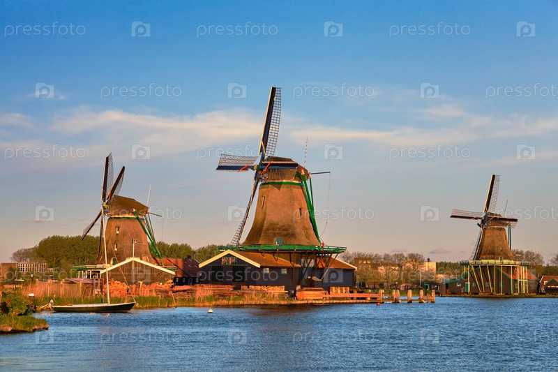 Ветряные мельницы на знаменитом туристическом объекте Заансе-Шанс в Голландии при закате с луной