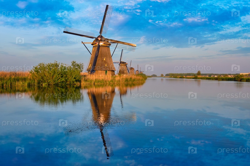 Голландский сельский пейзаж с ветряными мельницами на знаменитом туристическом месте Kinderdijk в Нидерландах при закате солнца с драматическим небом