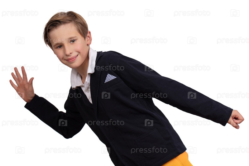 Портрет мальчика, который имитирует ходьбу на белом фоне.Ученик бежит, смотрит в камеру и улыбается