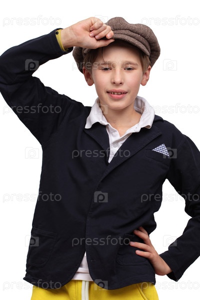 Портрет забавного мальчика в винтажной шляпе на белом фоне