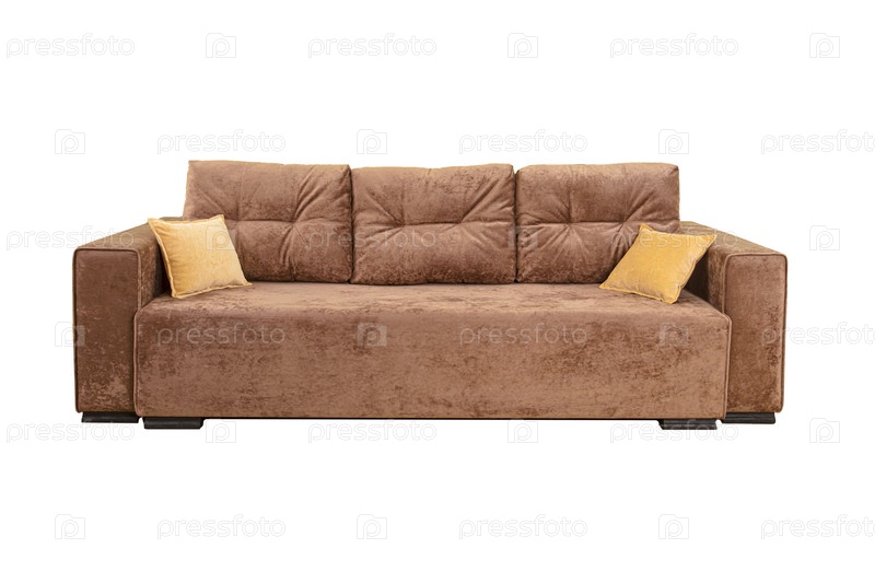 Коричневый диван из бархатной ткани изолирован на белом фоне