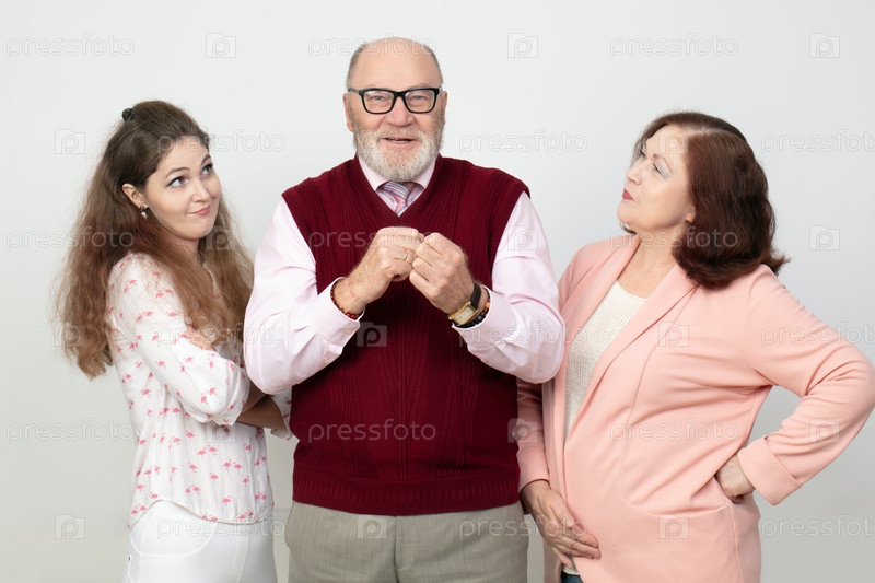 Фотография отца, которого упрекают или хитро смотрят взрослая дочь и жена