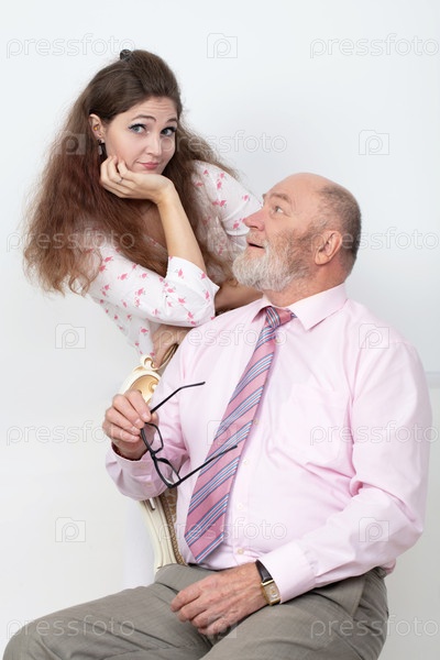 Портрет взрослой дочери и элегантного пожилого отца на сером фоне