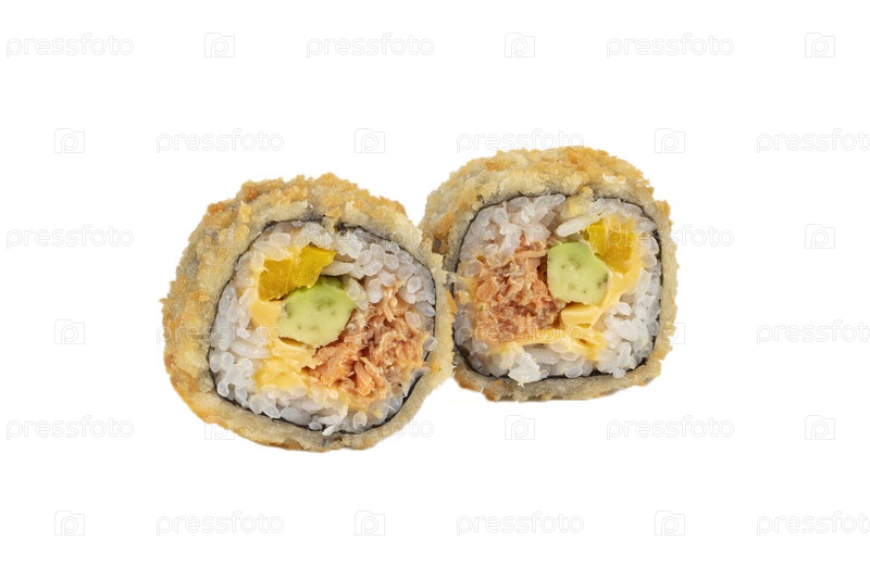 Суши-роллы на белом фоне с сыром из Филадельфии и лососем, выпеченным с сушеным тунцом