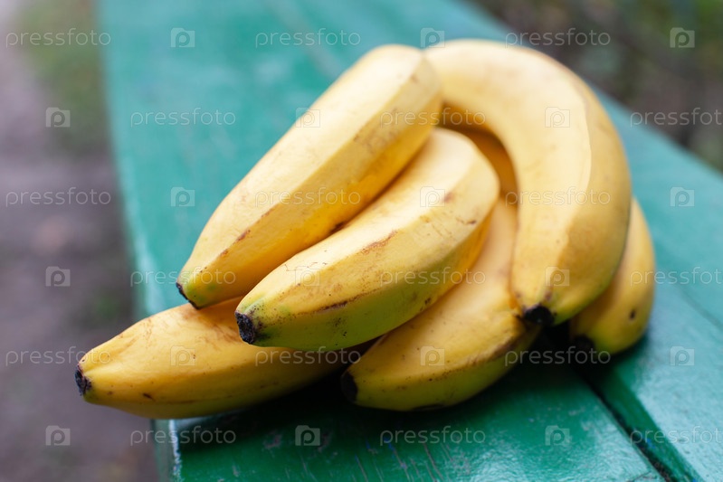 Желтая ветвь спелых бананов лежит на зеленой скамейке