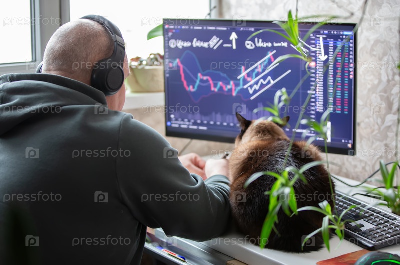 Трейдер-мужчина сидит дома за компьютером, отслеживает график на фондовой бирже, занимается торговлей и торговле акциями