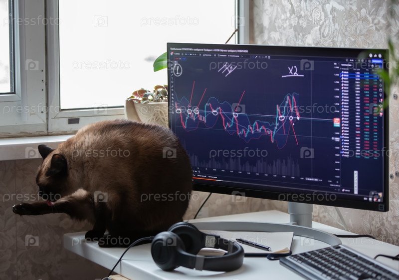 Стол трейдера с компьютером и домашним котом