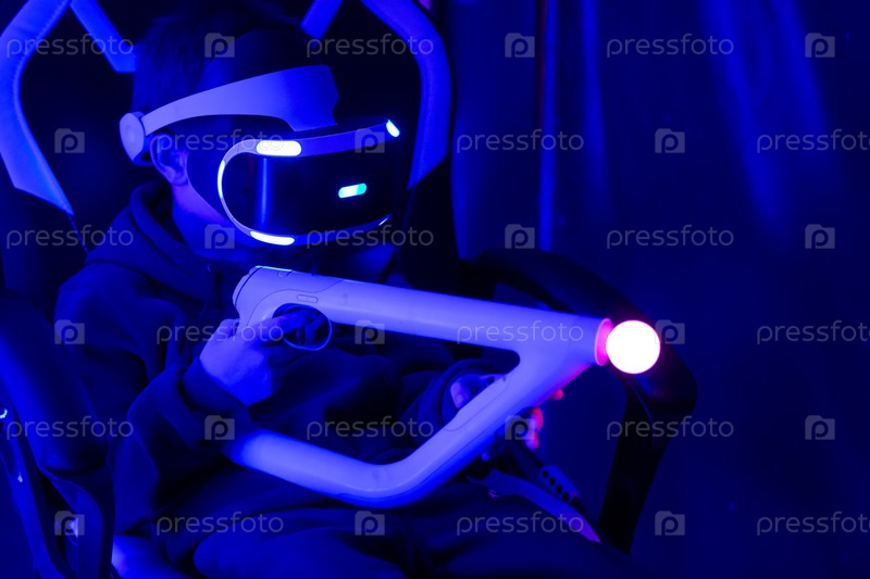 Мальчик играет в видеоигру с помощью контроллера. Контролер белый и имеет красный свет. Комната темная, а мальчик сидит на стуле