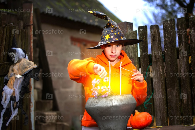 В Хэллоуин ребенок с волшебной шляпой в колдовской шапке совершает колдовство на фоне старого жуткого дома