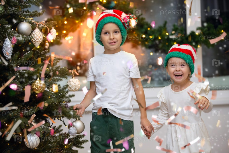 Дети наслаждаются Рождеством и смотрят волшебный золотой конфетти в шляпе Санты