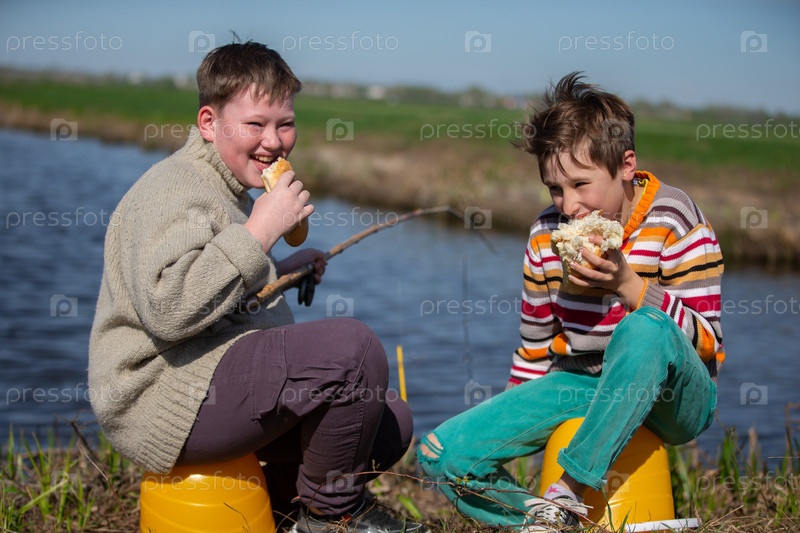 Мальчики заводили друзей во время рыбалки у реки, ели булочку и смеялись