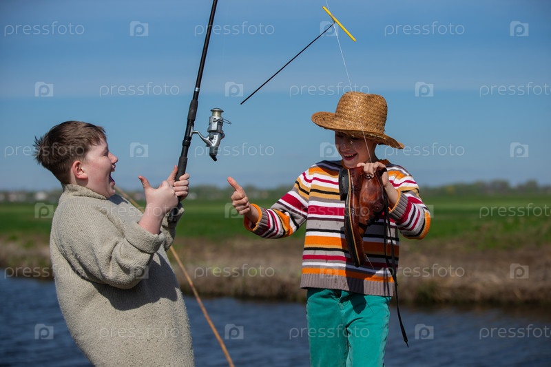 Два друга мальчика зацепили старую рыболовную удочку для обуви и посмеялись