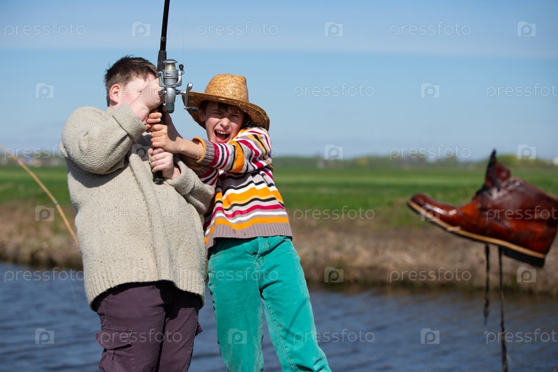 Два друга мальчика зацепили старую рыболовную удочку для обуви и посмеялись