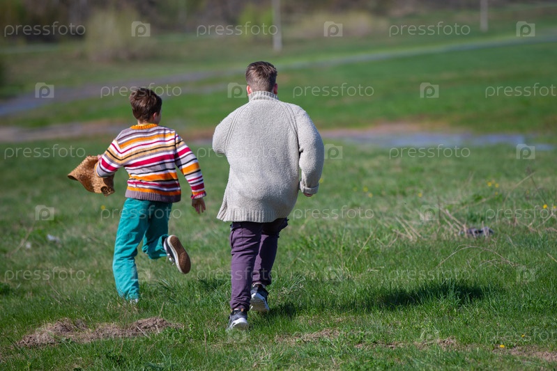 Двое мальчиков бегут друг за другом в природе.Дети на летних каникулах