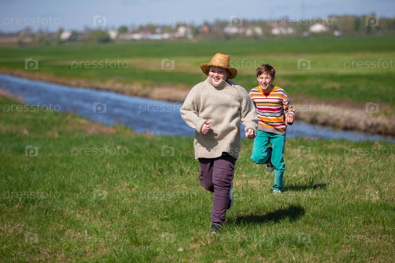 Двое мальчиков бегут друг за другом в природе.Дети на летних каникулах