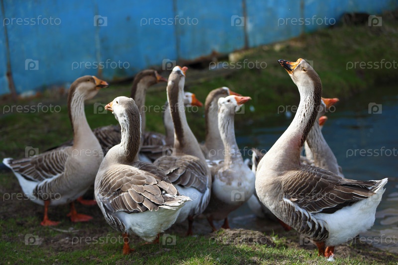 Стадо домашних гусей выходит на пастбище после купания в пруду