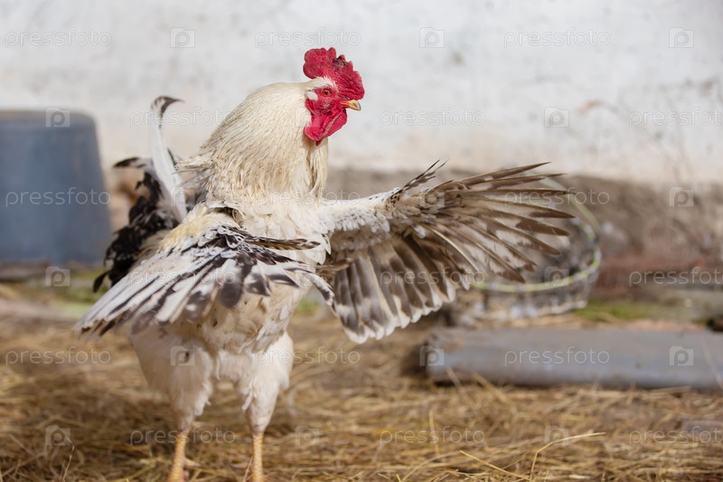 Птицы на ферме белый петух с пятнистым хвостом в крупном плане он зол и хлопает крыльями