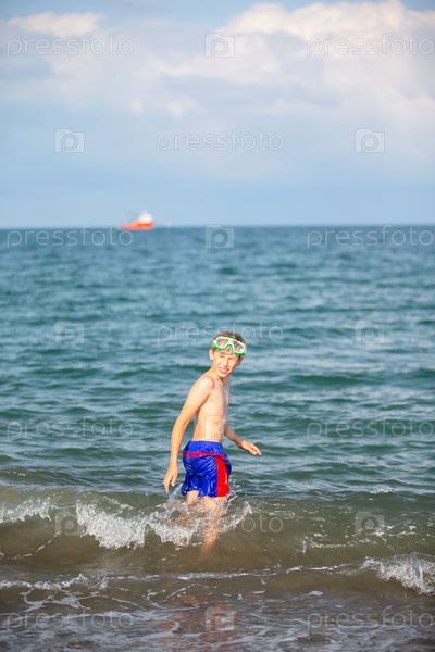 Вертикальная фотография мальчика в купальниках, идущего в море и оглядывающегося назад