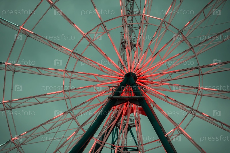 Большое, красочное колесо обозрения с красными и белыми огнями в древнем изумрудном оттенке