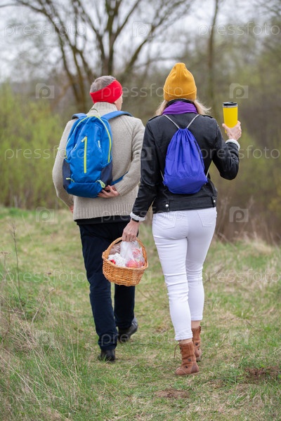 Активная пожилая пара гуляет с рюкзаками, наслаждаясь приключениями
