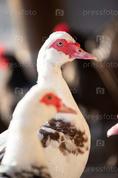 Близкий план стада мускусовых уток, также известных как индушеты в птицекомнате