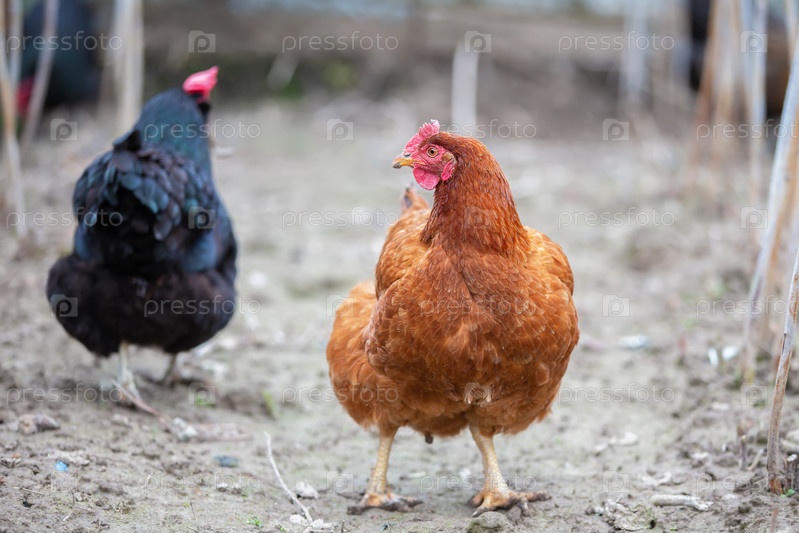 Рыжеволосая курица стоит перед другой курицей.Два цыплята на грязном поле