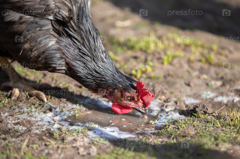 Близкий план черного петуха, пьющего воду из грязевой лужи