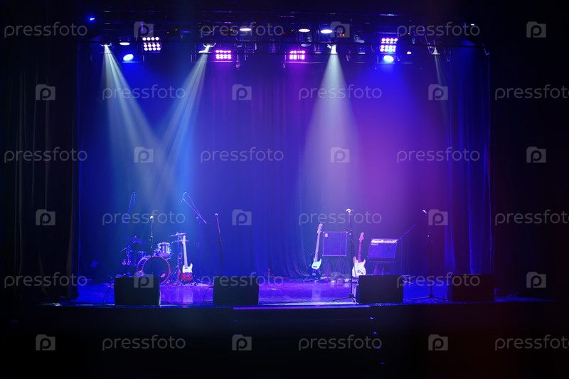 Темный фон сцены с музыкальными инструментами освещается синим прожектором
