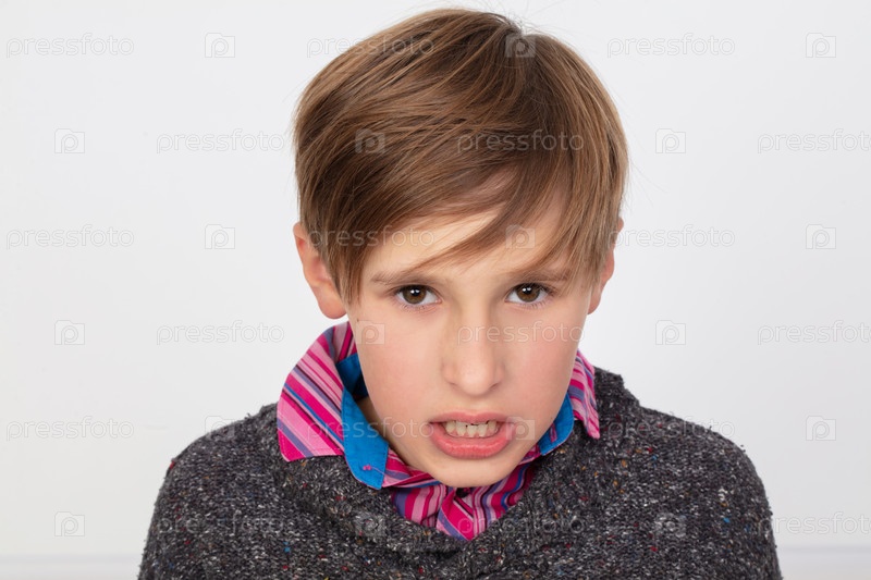 Мальчик в полосатой рубашке и синем шарфе смотрит на камеру с хмурым выражением лица