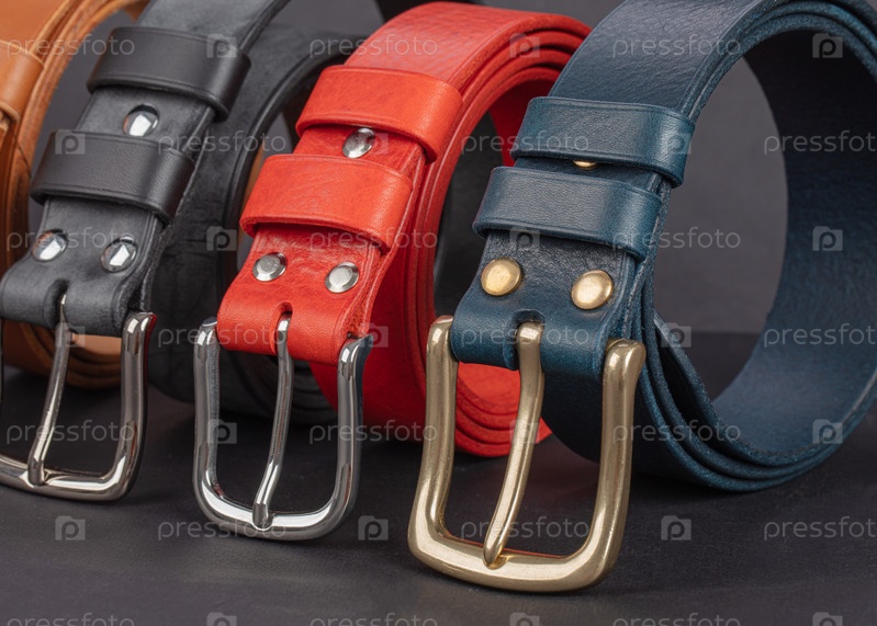 Кожаные пояса с металлическими запорами на сером фоне